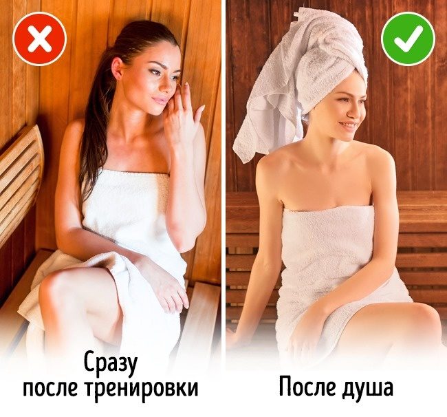 После интенсивной работы в зале не стоит сразу идти в баню или сауну. Во время тренировки теряется много жидкости, а давление повышается. В результате поход в сауну может обернуться плохим самочувствием или даже обмороком. Перед тем как попариться, лучше попейте воды и сходите в душ.
