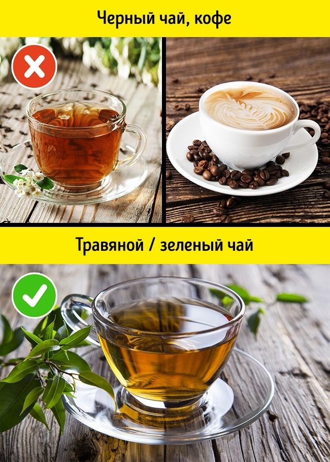 Лучше отказаться от черного чая и кофе в пользу травяного или зеленого чая — они не влияют на кислотность, да и на нервную систему действуют скорее успокаивающе.