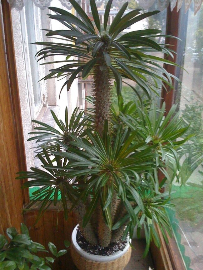 Это растение напоминает одновременно и пальму, и кактус. Цветоводы любят называть его мадагаскарской пальмой за толстый ствол и пышную листву. Пахиподиум настоятельно не рекомендуют размещать в детских комнатах из-за высокой ядовитости его сока, а также колючек, расположенных по всей длине ствола.