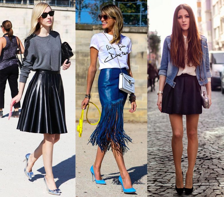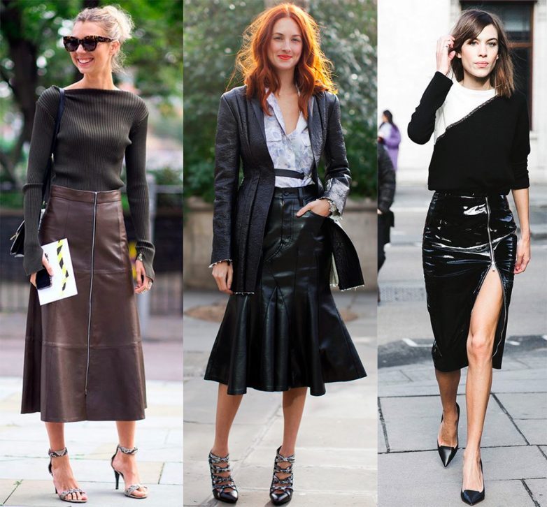 В коллекциях модных брендов множество юбок из кожи, от юбки-карандаш до сложных моделей с асимметрией, разнообразными вырезами и необычным декором. Какую выбрать? Если у вас это первая кожаная юбка, купите модель прямого силуэта. Такие юбки очень вариативны и прекрасно сочетаются со свитерами, жакетами, блузками или топами. Еще можно купить юбку с запахом, модель длины макси и с бахромой.