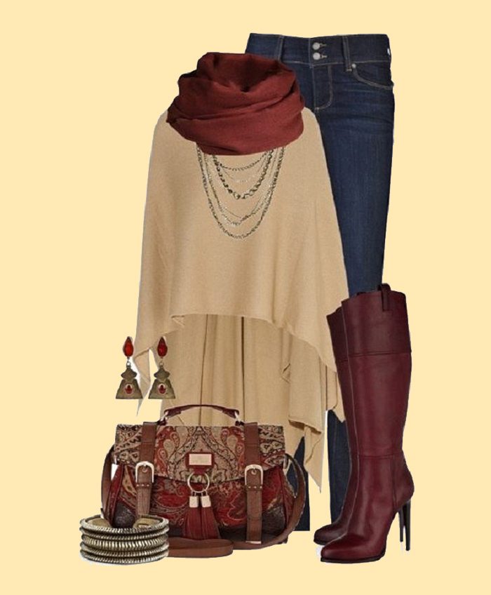 2. Бордовые и винные оттенки смотрятся осенью так согревающе. Они отлично сочетаются с другими цветами, особенно с синим, черным и бежевым. Между прочим, сейчас модно подбирать сумку, обувь и платок в одной гамме, но не в одном цвете.