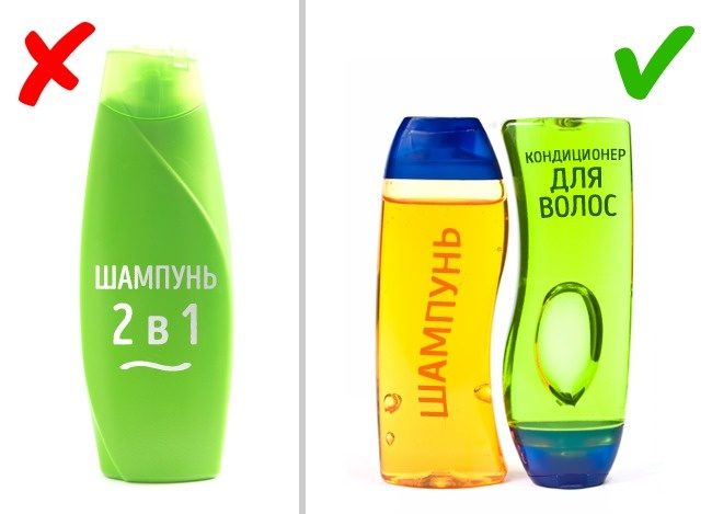 Любой химик удивленно приподнимает брови, видя данное средство. Ведь шампунь, главная цель которого — очистить волосы и кожу головы, имеет слабую щелочную среду, а бальзам, наоборот, «жирнит» наши волосы, заполняя их структуру и питая. Парикмахеры даже рекомендуют мыть шампунем только корни волос, а бальзам наносить только на сухие концы. А средство, совмещающее эти 2 свойства, просто невозможно с химической точки зрения. Так что «шампунь 2 в 1» — это просто обычный шампунь.