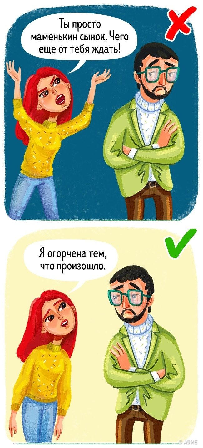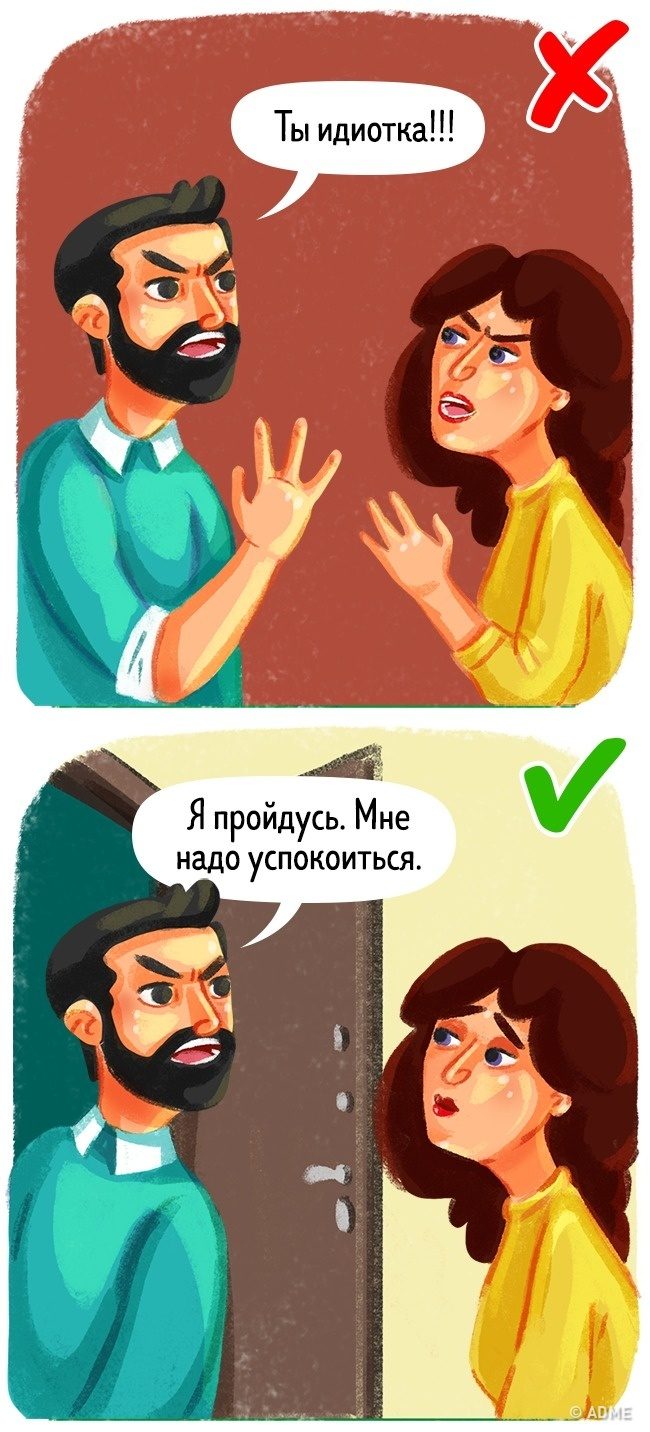 Попробуйте внутренне говорить себе «стоп» всякий раз, как вы хотите сказать близкому человеку обидное слово. Если вы чувствуете, что не можете совладать с собой, возьмите паузу. Только не используйте это как манипуляцию, наказывая партнера изоляцией. Скажите, что вернетесь к разговору, когда успокоитесь. И непременно сдержите свое слово.