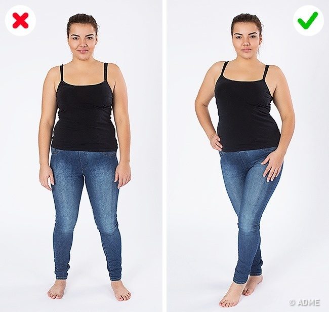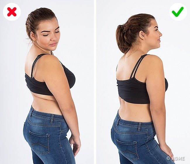 Как бы банально это ни звучало, но держите спину ровно, особенно когда сидите. К сожалению, многие об этом забывают. Ровная осанка убирает складки на животе, делает руки привлекательнее, а ноги тоньше и длиннее.