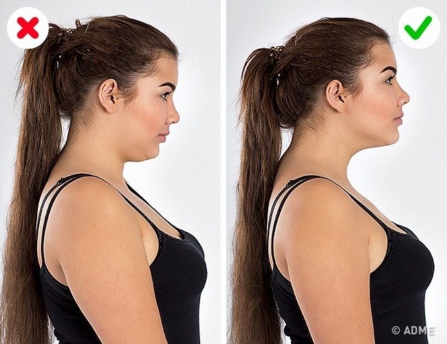 Второй подбородок может появиться на фотографии у девушки любого телосложения. А все из-за неправильного положения головы. Чтобы избавиться от второго подбородка, достаточно слегка выдвинуть голову вперед и упереть середину языка в небо.