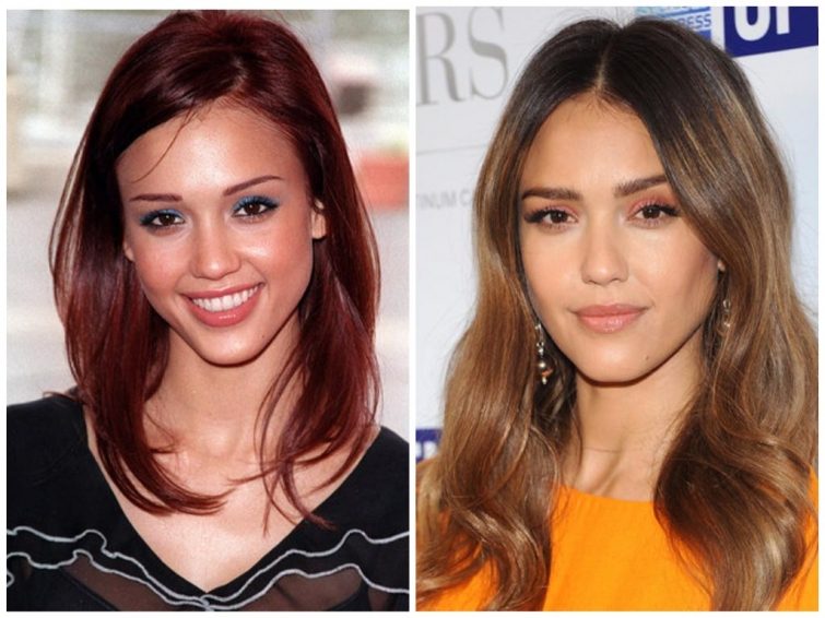 Темные брови-«ниточки» смотрелись на Лере Кудрявцевой слегка несуразно, делая ее глаза визуально меньше, а остальные черты лица — больше. Но Лера успешно выполнила работу над ошибками: сейчас у нее широкие темно-коричневые брови с красивым изгибом.Джессика Альба
