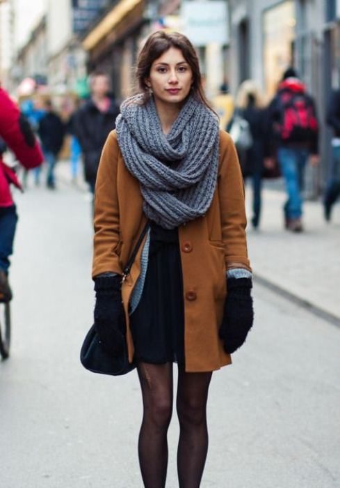 Широкий и не очень длинный шарф можно спустить на плечи. Так он будет выглядеть, как палантин. Таким образом можно дополнить облегающее платье или водолазку. Хорошо, если снуд будет совпадать по цвету с одеждой или, напротив, контрастировать.