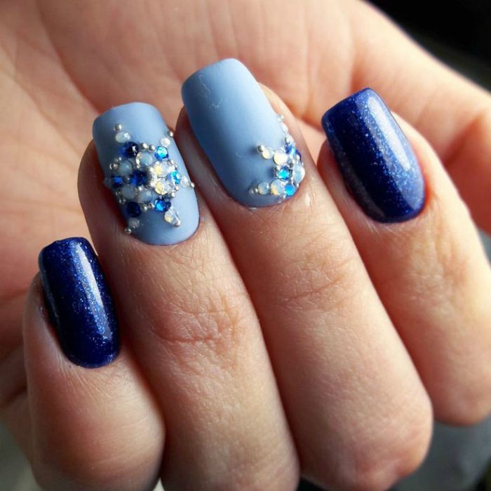 Рисунки снежинок на ногтях выглядят немного банально. А вот объемные снежинки из страз на голубом и синем фоне станут прекрасным выбором для новогоднего маникюра 2018.
