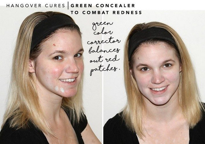 Румянец – это мило, но румянец после алкоголя может предательски выдавать, что же вы делали прошлым вечером. Поскольку сильную красноту скроет редкий тональный крем, используйте консилер зелёного (мятного) оттенка. Он нейтрализует проблемные участки и послужит хорошей базой под макияж, если он вам нужен. Кстати, от матирующего тонального крема лучше пока отказаться: он безжалостно подчеркнёт сухость кожи. А вот увлажняющий ВВ или СС-крем может быть очень кстати.