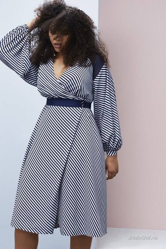 Самый простой способ скрыть пышные бедра – увести от них внимание наверх. Куда именно, решать только вам. Варианты:Притягиваем взгляды к декольте. Здесь беспроигрышный выбор – платье средней длины с запахом. Оно удобное, смотрится стильно и красиво. V-образный вырез выгодно подчеркнет грудь, а юбка-солнце скроет лишний объем.