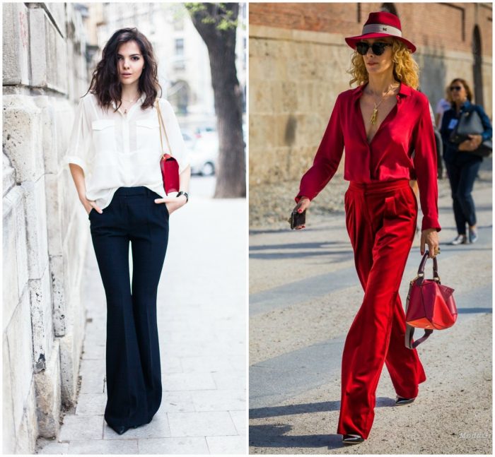 Штаны клеш снова в моде. Причем среди самых популярных моделей, брюки расклешенные от самого бедра. Такие штаны подойдут, как высоким девушкам, так и низкорослым. Во втором случае под широкими штанинами получится спрятать высокий каблук или платформу.