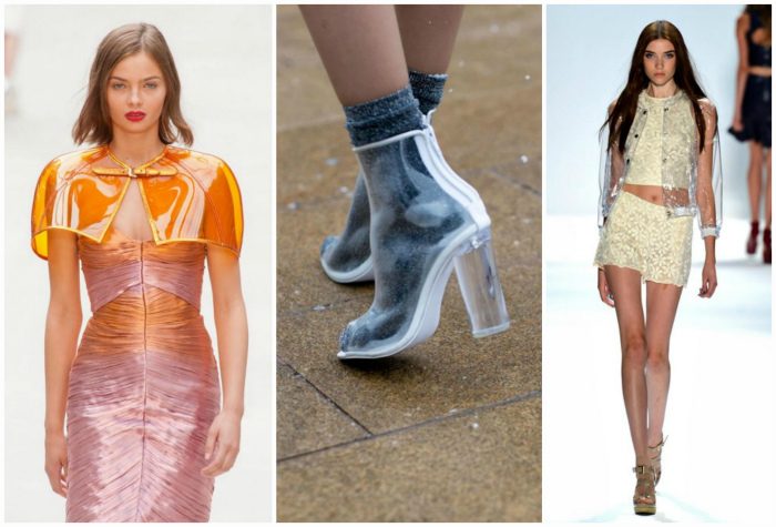 Одежда из клеенки на мировых подиумах появилась еще в прошлом году. В этом году данный тренд только укрепил свои позиции. В коллекциях Chanel, Marc Jacobs, Burberry and Christopher Kane то и дело мелькали шляпы из прозрачного пластика, накидки и ботфорты. Несмотря на всю противоречивость этих вещей, они прекрасно подойдут для защиты от весенних дождей и непогоды.
