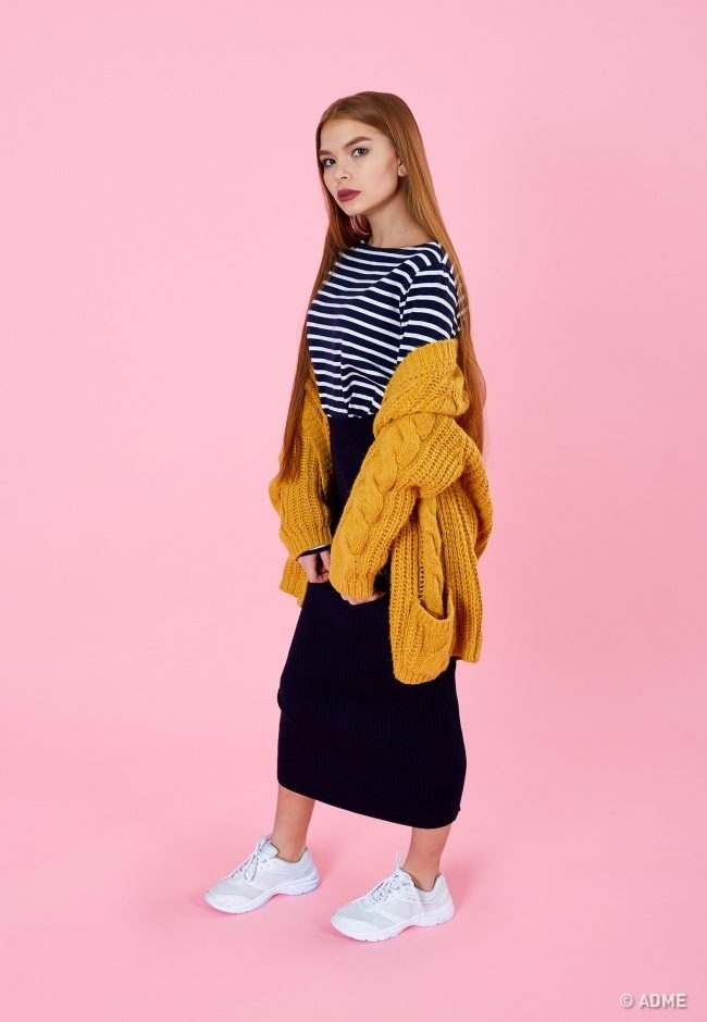 Вязаный широкий свитер, свободная длинная юбка и, конечно же, удобные кроссовки. Этот образ можно назвать одним словом: комфорт. Идеально для вечерних посиделок с друзьями.