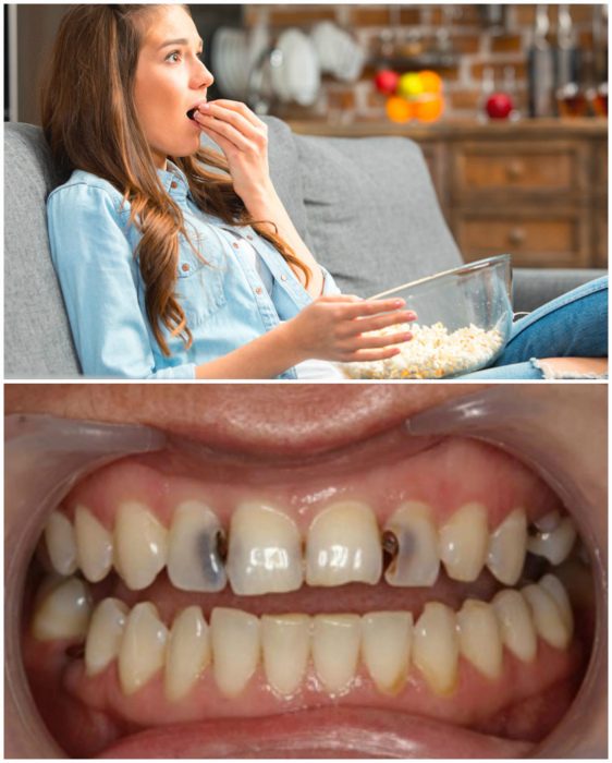 Любители попкорна, как и курильщики рискуют заполучить серьезные проблемы с зубами. Мелкие частицы жареной кукурузы застревают между зубами так, что их не вычистит никакая зубная щетка. Оставаясь там они разрушают зубную эмаль и способствуют появлению кариеса.