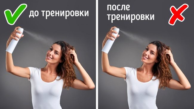 Использовать сухой шампунь после спортзала почти бесполезно: после тренировки волосы уже настолько жирные, что он почти ничем не поможет. Лучше нанести немного спрея перед тем, как отправиться в спортзал, так он поможет поглотить пот во время тренировки.
