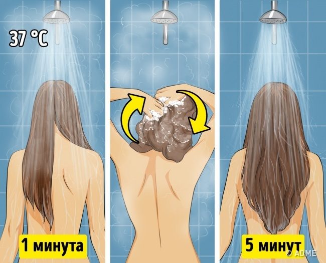 1. Вода должна быть комфортной температуры. Постойте под душем с минуту и убедитесь, что волосы полностью намочены.
