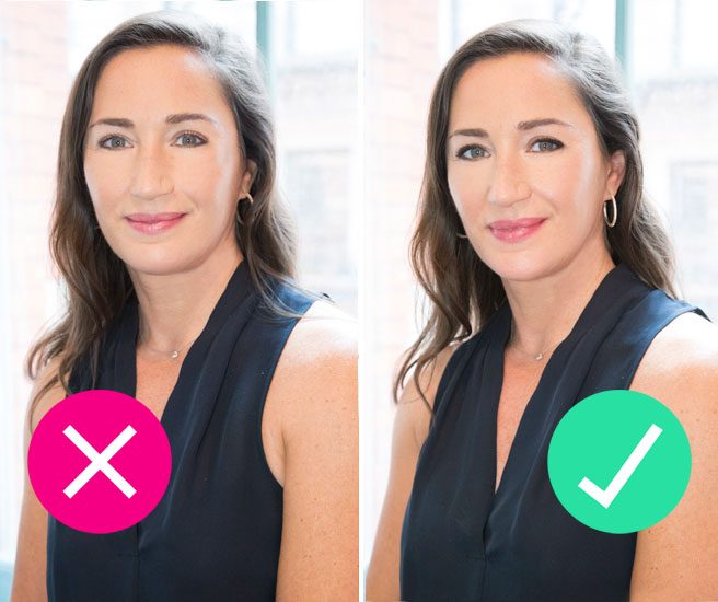 Знаете старое выражение «чем меньше-тем лучше». Так вот с тональным кремом дела обстоят точно так же. Чем тоньше слой тональника — тем лучше.Наносить румяна слишком низко