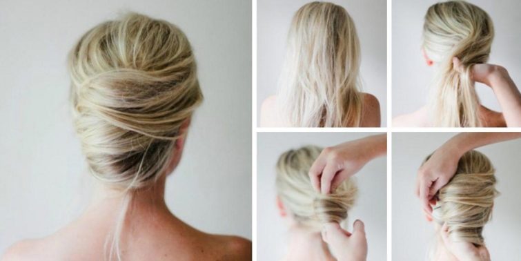Сделайте низкий хвост. Просуньте под него руку и пальцами проделайте в волосах дырку. Выверните в это отверстие хвост — так вы спрячете резинку. Оставшуюся часть хвоста расчешите, сверните улиткой и зафиксируйте при помощи шпилек.
