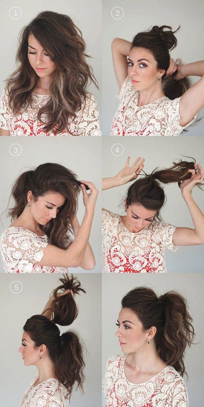 Разделите волосы на две части. Сделайте низкий хвост и закрепите его резинкой. Верхнюю часть волос слегка начешите у корней. Сделайте высокий хвост и накройте им нижний.