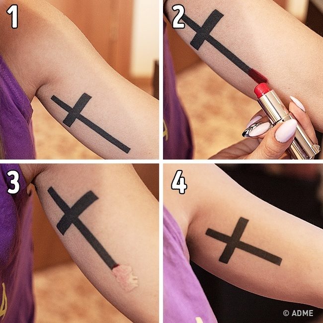 Чтобы временно замаскировать татуировку, нужно нанести на нее помаду и дать ей высохнуть. Следующим слоем нанесите плотный тональный крем и зафиксируйте лаком для волос.