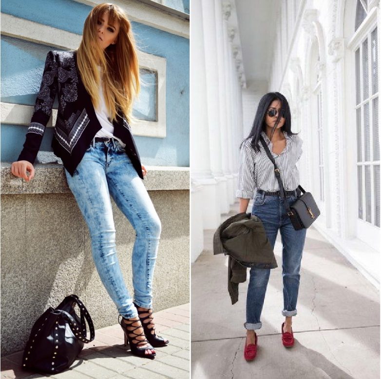Лаковые туфли на тонкой шпильке и джинсы-варенки помогут создать модный образ, который был актуален в 80-х годах. Такой ансамбль подойдет для тематических вечеринок, но не для повседневного стиля.