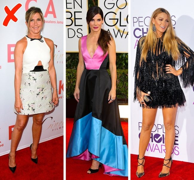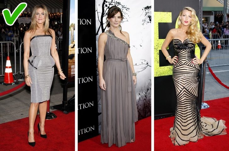 Недопустимо деление фигуры по горизонтали, также исключаются рюши и оборки, кукольный объем платьев, излишне открытая одежда.