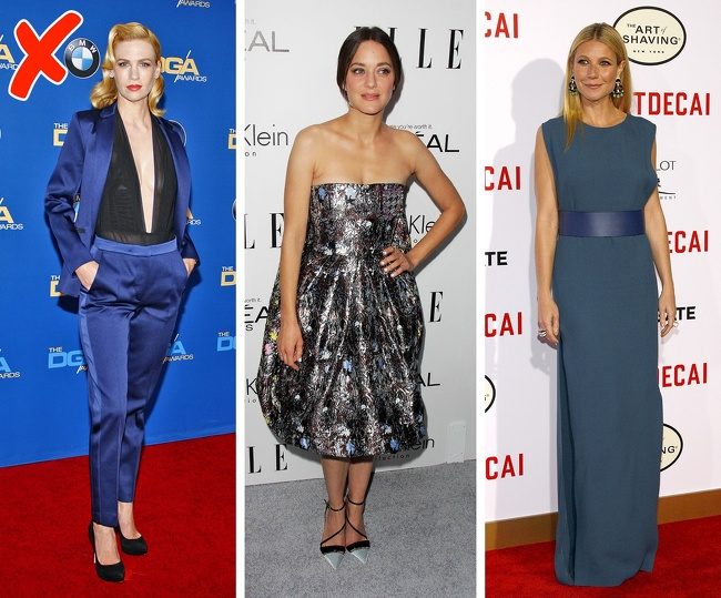 Мягко струящиеся линии, прозрачные, тонкие, «летающие» или липнущие к телу ткани — под запретом. Это касается и широких или бесформенных силуэтов, крупной вязки, грубого трикотажа.Недопустимо деление фигуры по горизонтали, также исключаются рюши и оборки, кукольный объем платьев, излишне открытая одежда.