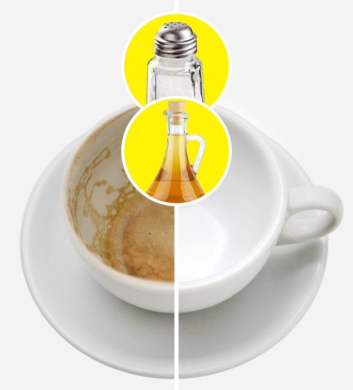 Возьмите 1 столовую ложку соли и 1 столовую ложку уксуса, смешайте и положите в чашку с трудновыводимыми пятнами от кофе и чая. Подождите пару часов и затем вымойте посуду как обычно.
