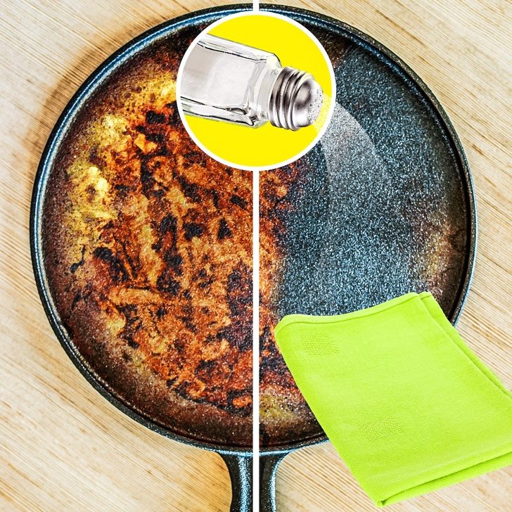 Возьмите 1 стакан соли и высыпьте на жирную поверхность сковороды. Затем простым кухонным полотенцем хорошенько протрите все грязные места, пока они не станут чистыми. В конце промойте сковороду как обычно.