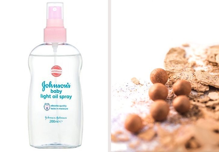 Получить сияющую кожу, как у моделей на показах Victoria’s Secret, можно не прибегая к дорогим маслам и шиммерам для тела. Если у вас есть ненужные золотистые тени или любимый, но разбившийся бронзер, подарите им вторую жизнь, просто смешав их с любым детским маслом-спреем.8. Пудра между слоями туши для объема