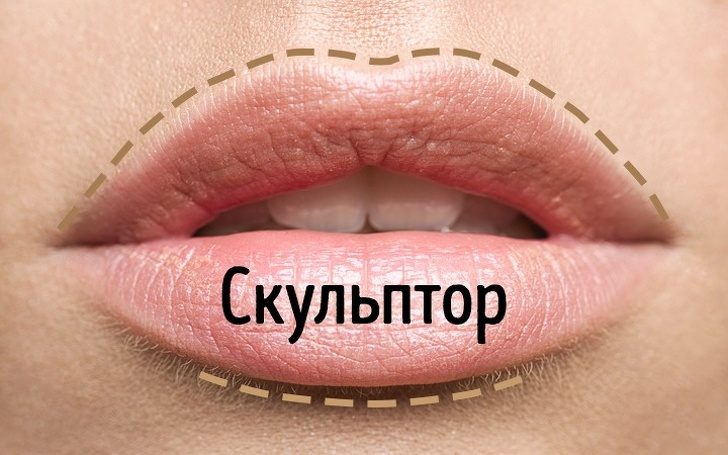 Сделать губы визуально пухлее можно с помощью скульптора для лица и тонкой кисти. Хитрость, которую часто используют для макияжа звезд на ковровой дорожке, заключается в том, чтобы создать дополнительный объем, прорисовав тень под нижней и над верхней губой. Отступив 2–3 мм, прорисуйте очень тонкую линию там, где это указано на схеме, и для большего эффекта добавьте хайлайтер по контуру верхней губы.