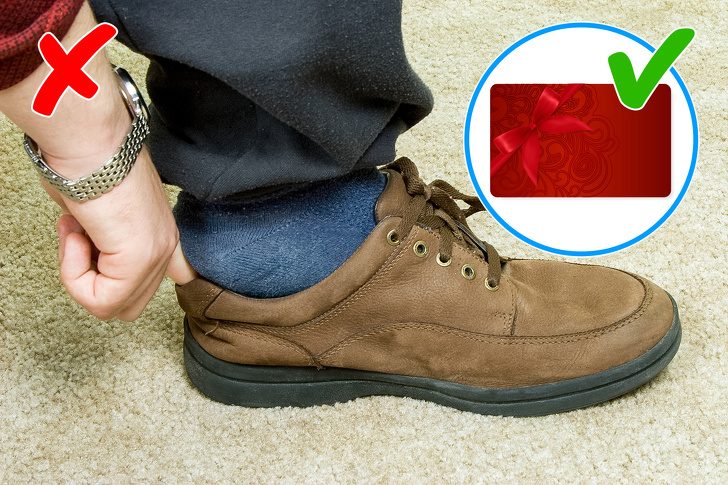 Ежедневное использование ложки — очень хорошая и полезная привычка, которая предотвращает много проблем. Не пренебрегайте ложкой, без нее задник быстро обминается и теряет форму, а обувь перестает фиксировать голеностопный сустав, что может спровоцировать травмы и мозоли. Если ложки под рукой не оказалось, воспользуйтесь любой пластиковой дисконтной карточкой. Она легко гнется и хорошо скользит.6. Пятна на обуви из замши и нубука