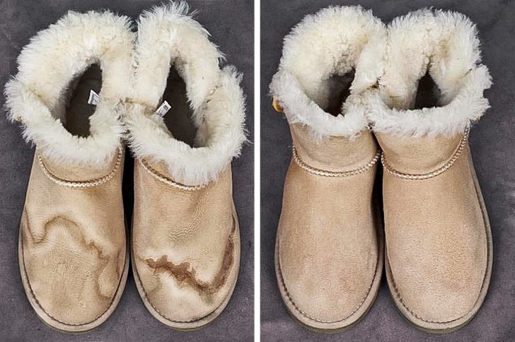 В холодное время года улицы посыпают реагентами, которые очень вредят обуви, разрушают ее и оставляют некрасивые разводы. Вывести солевые следы можно уксусом. Разбавьте его водой в соотношении 1:3 и протрите обувь мягкой тряпкой. Желательно так поступать каждый раз, когда вы возвращаетесь домой.8. Грязь на яркой тряпичной обуви