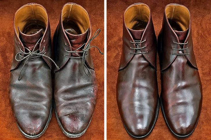 Со временем на кожаной обуви появляются заломы, похожие на морщинки. На самом деле кожа обуви такая же, как кожа на нашем теле, поэтому ее нужно питать специальным кремом. Нанесите крем на обувь, оставьте на пару часов для впитывания и затем начинайте полировать. В качестве альтернативы можно использовать вазелин или детский крем.