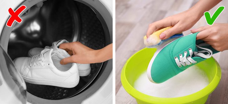Во многих стиральных машинках есть режим стирки спортивной обуви, но лучше не использовать его, потому что при кручении барабана материалы, из которых сделаны кроссовки, сильно изнашиваются. Вода попадает во внутреннюю часть подошвы, и из-за этого при сушке она усыхает и теряет форму, верх расклеивается и начинает ворситься.Ухаживайте за кроссовками вручную: расшнуруйте их, выньте стельки и аккуратно потрите. Для сильных загрязнений используйте старую зубную щетку. Внутри можно протереть спиртом для дезинфекции.