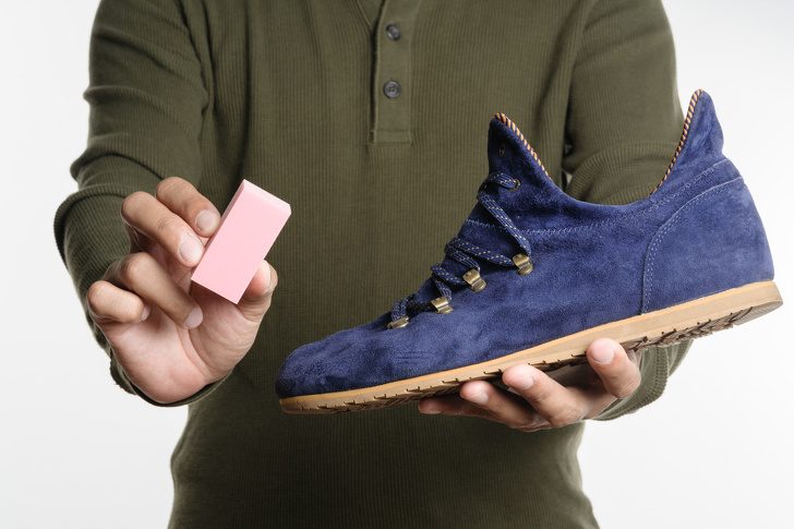 Для ухода за ворсистыми материалами отлично подойдет обычный ластик. При трении о поверхность ластик крошится и проникает вглубь ворса, крошки цепляются за пыль и грязь и «покидают» замшу или нубук вместе с загрязнениями. Потом крошки нужно вычистить щеткой для обуви.