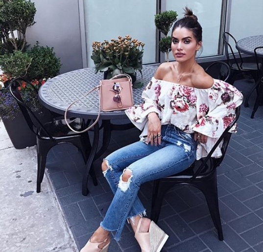 3. В моде открытые плечи и цветочный принт. Такая романтическая блузка отлично уравновесится узкими джинсами с прорезями. Образ получится в меру нежным и дерзким.