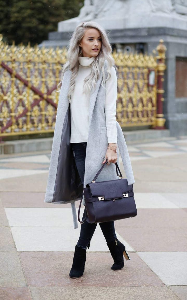 Если ваша душа стремится к ярким краскам и очень хочется радовать глаз теплом красок – этот образ для вас. Сочетание светло-рыжих укороченных брюк с жилетом модного фиалкового оттенка – более чем броско и дерзко. Завершить образ помогут свитер и обувь спокойной гаммы и рыжая сумка. Розовый жилет с большим воротником прекрасно смотрится с джинсами скинни. Для повседневного образа подойдут классическая обувь и яркая сумка. Если ваша цель строгий, но женственный образ, выбирайте холодную цветовую гамму. Белый свитер с большим воротом и серый жилет, например. Дополнив комплект черными узкими брюками и ботинками в тон, не забудьте про красивую классическую сумку.Образ в похожей цветовой гамме сделать более броским поможет яркая деталь в виде красивой сумки цвета бордо.