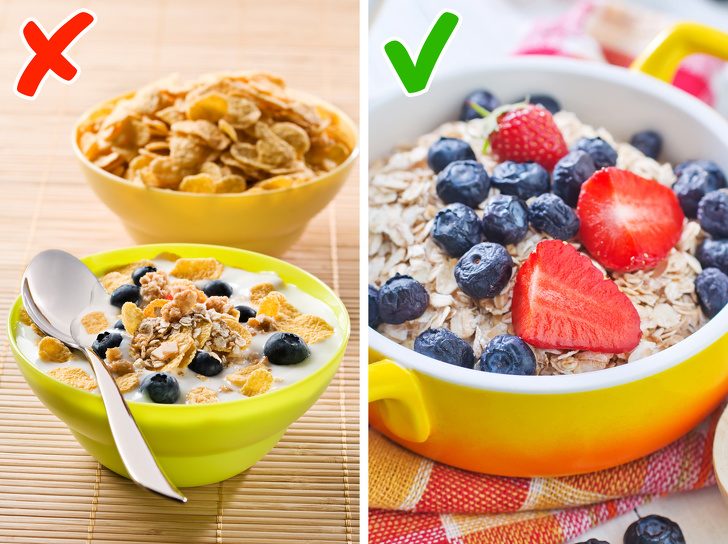 Чтобы сделать первый прием пищи здоровее, включите в рацион каши на воде или молоке, а хлопья замените мюсли без сахара. В качестве добавок к ним можно использовать орехи и сухофрукты.