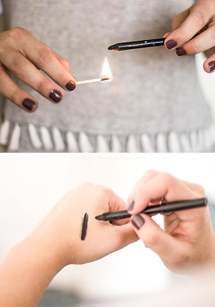 Чтобы добиться от классического карандаша для глаз идеальной тонкой и равномерной линии, можно растопить кончик карандаша с помощью спички или зажигалки. Этот трюк позволит достигнуть гелевой текстуры и может выручить в ситуации, когда подводки нужного оттенка нет под рукой или она предательски высохла в самый неподходящий момент.