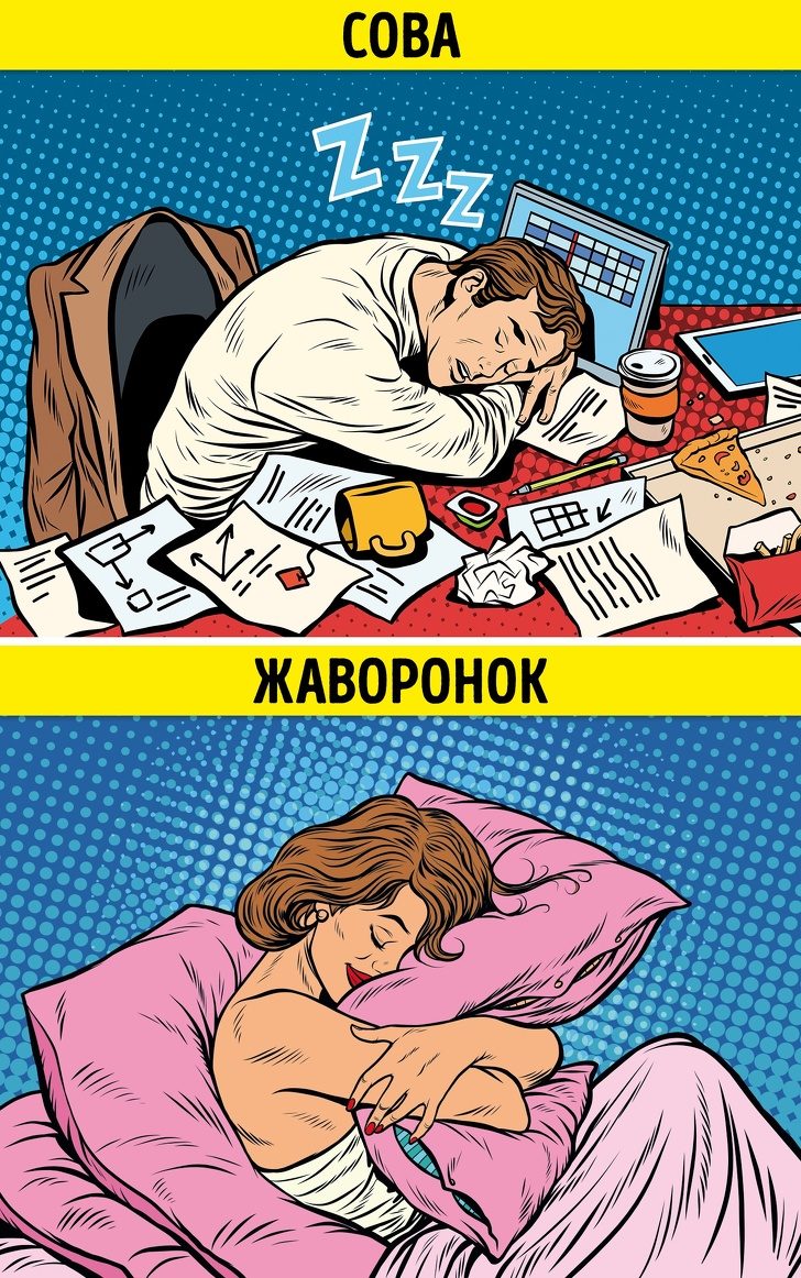 Совы. Предпочитают брать на себя ответственность и выполнять работу в одиночку. Только полагаясь на собственные силы, не отвлекаясь на мнение остальных, они могут показать наилучший результат. Поэтому не бойтесь проявлять инициативность и брать отдельные проекты под свое полное руководство, у вас точно получится все наилучшим образом.Жаворонки. Настоящие командные игроки. Брейнштормы и кооперация — вот их путь к победе! Жаворонки с радостью поделятся знаниями и дадут хороший совет, поэтому нередко становятся любимчиками в коллективе. Так что, если вы столкнулись с тяжелой задачей, не стесняйтесь просить помощи у других, ведь благодаря вашей открытости коллеги с радостью придут вам на помощь.