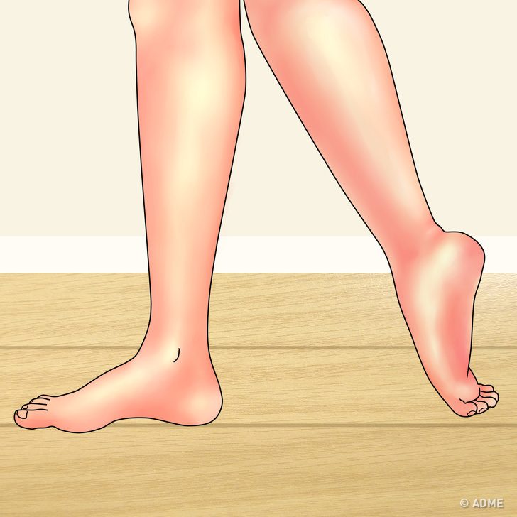 Встаньте прямо, ноги поставьте вместе.Поднимитесь на носках как можно выше и задержитесь в таком положении на 30 секунд.