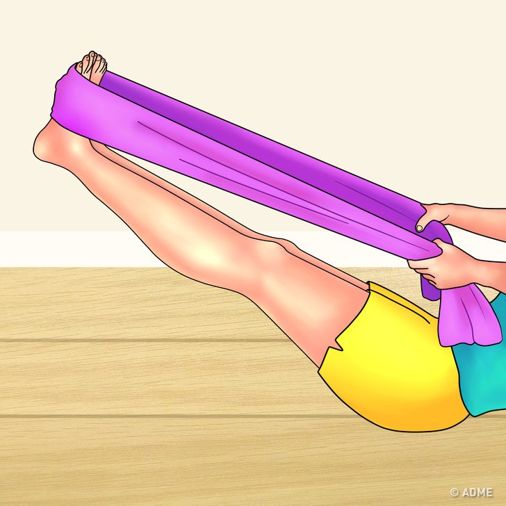 Сядьте на пол, выпрямите спину, ноги вытяните вперед.Обхватите стопу одной ноги эластичной лентой, ремнем или просто куском ткани достаточной длины.