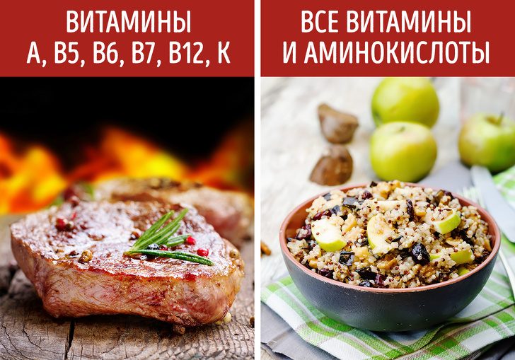 Гораздо безопаснее заменить животный белок растительным. Некоторые растительные продукты (бобы, киноа, греча, соя) содержат все незаменимые аминокислоты сразу. Но, чтобы получить полный состав аминокислот и витаминов, одних блюд из бобов будет мало. Придется внести разнообразие в меню.