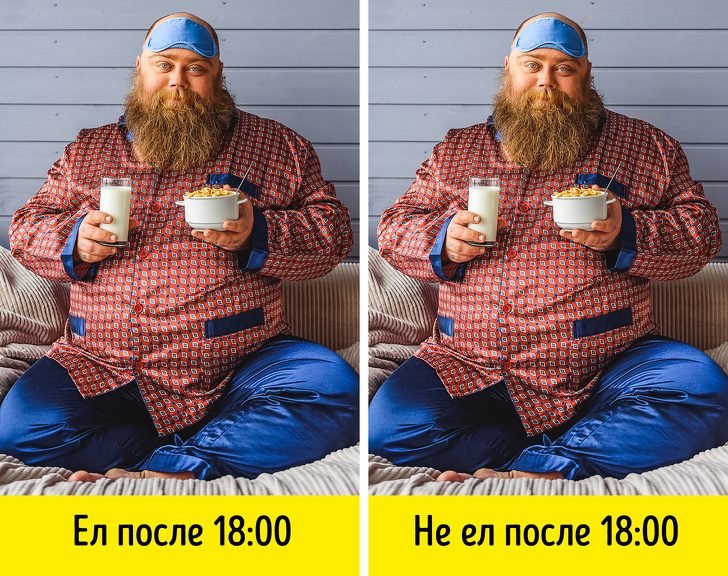 К примеру, в одном эксперименте группа здоровых мужчин перестала потреблять пищу с 19:00 вечера до 6:00 утра. За 2 недели каждый из испытуемых похудел примерно на полкилограмма. Затем участники вернулись к привычным поздним ужинам и снова набрали потерянный вес.