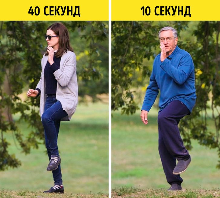 ровно встаньте на полу, соединив ноги, и закройте глаза; поднимите и согните в колене одну ногу — левую, если вы правша, и правую, если вы левша; засеките время, чтобы оценить, как долго вы сумеете продержаться в такой позе до потери равновесия.В норме для 30-летнего человека, который не испытывает больших проблем с вестибулярным аппаратом, это время составляет 20 секунд и выше, тогда как пожилой «аист» не продержится и 10 секунд.