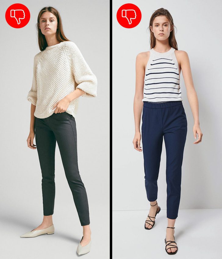 зауженных брюках (они придадут фигуре форму моркови);
