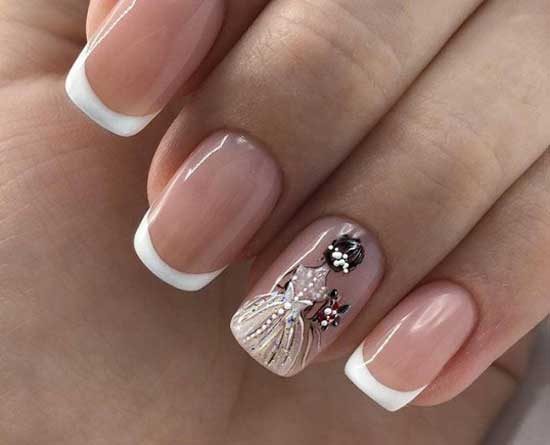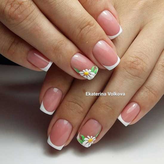 Сегодня мастера ногтевого сервиса предлагают множество различных вариантов френча — элегантный французский дизайн по-прежнему находится на острие моды. Подходящий вариант сможет найти для себя каждая девушка. К примеру, как насчет белого френча и крошечной ромашки — классный акцент?