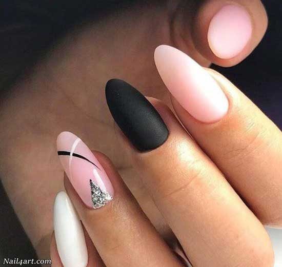 Такой вариант выглядит классно и очень интересно. Чтобы маникюр получился эффектным, можно сыграть на контрастах цветов, к примеру, черного, нежно-розового и серебра.
