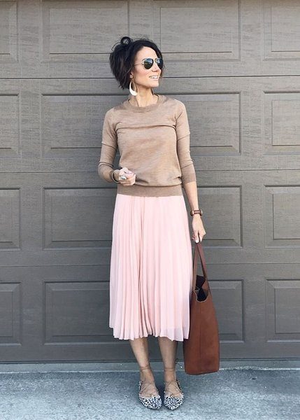 Юбку-плиссе розового цвета вы спокойно можете проносить и всю осень и всю зиму. Верх лучше подбирать более тёмного оттенка. Бежевая юбка с запахом будет в моде в эту осень.